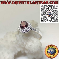 Elegant 925 sterling silver ring featuring a small round garnet, bezel-set and surrounded by a halo of sparkling white zircons, with additional zircon rows on each side. A refined, brilliant design perfect for special occasions or everyday elegance.