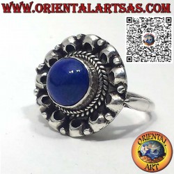 Silver ring with round cabochon lapis lazuli surrounded by balls...