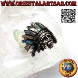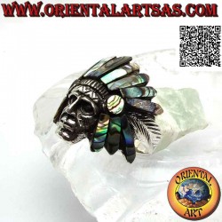 Silver ring, head of Native American Indian sage with abalone (paua) headdress and feathers on the sides (B)
