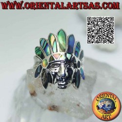 Silver ring, Native American Indian sage head with abalone (paua) headdress and smooth face