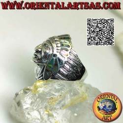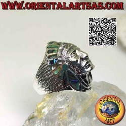 Silver ring, Native American Indian head with carved face and medium abalone (paua) feather headdress