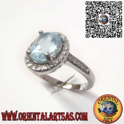 Elegant 925 sterling silver ring featuring a natural oval-cut blue topaz, surrounded by a sparkling halo of white zircons.