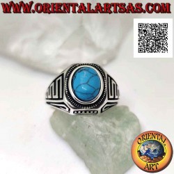 Silver ring with oval cabochon turquoise and waves in bas-relief on the sides