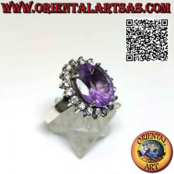 925‰ Silver ring with a splendid natural oval amethyst surrounded by round zircons