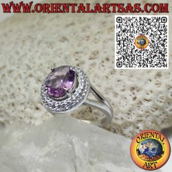925 sterling silver ring with natural oval amethyst and double row of sparkling zirconia. Elegant and refined jewellery, perfect for any occasion.