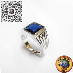 This elegant men’s ring, crafted from 925 sterling silver, features a rectangular-cut blue synthetic sapphire with deep, captivating brilliance. The solid band is adorned with handcrafted side engravings, adding a refined and distinctive touch.