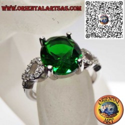 Stunning Sterling Silver 925 ring featuring an intense oval-cut synthetic Emerald. The central gem is elegantly framed on both sides by a bright Zircon cluster, adding a touch of luxury and brilliance.