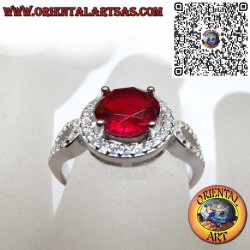 A piece of jewelry that expresses love and passion with unparalleled refinement. This Sterling Silver 925 Ring is dominated by a high-quality Synthetic Ruby with a classic round cut, which radiates an intense and vibrant red color. The central gem is framed by Zircons, creating a magnificent, elegant brilliance. The ornamentation also extends to the sides of the band, where other Zircons add an extra sparkle and complete the design. The combination of the Ruby, a symbol of love and vitality, with the shimmer of the Zircons makes this ring a luxury accessory and a perfect gift to celebrate anniversaries, birthdays, or Valentine's Day. Material: Silver 925. Main Gems: Synthetic Ruby (Round). Secondary Gems: Zircons. Design: Classic, elegant.