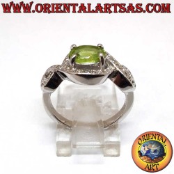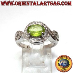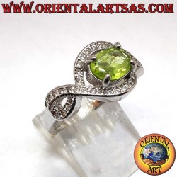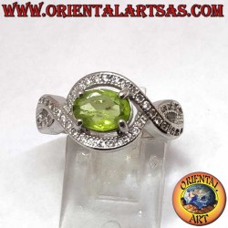 Elegant high jewelry 925 Sterling Silver ring with a natural oval peridot of 7x5 mm, surrounded by an infinity knot pavé-set with zircons. Symbol of eternal love, positive energy and rebirth. Weight 3.8 grams. A precious piece with deep meaning.