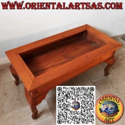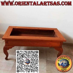 Rectangular low display table handcrafted in solid teak wood, featuring elegant Louis XIV-style legs and an opening 4 mm glass top (included). A unique piece sourced from Indonesia, this table is ideal for showcasing collectibles, decor, or precious items.