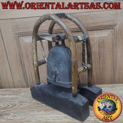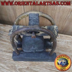 Ancient bronze bell with Airavata (three-headed elephant) in high 3D relief. In Hindu mythology, Airavata is the mount of the god Indra, guardian of the cardinal points and symbol of rain, fertility and abundance. The three heads represent Past, Present and Future or Heaven, Earth and Hell. In Thailand and Laos, it is a national symbol of protection and majesty. Origin: Karen villages of Burma. Material: bronze. Bell height 15 cm, base 10x7 cm, weight 780 g. Total structure: height 27 cm, base 21x11 cm. Unique handmade piece.