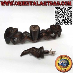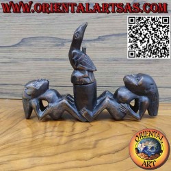 Rare oil lamp sculpture of two men praising the illuminated Fertility Bird carved from a single log of Borneo Ironwood (Eusideroxylon zwageri). Unique unique piece purchased in 1985 in Western Bornio