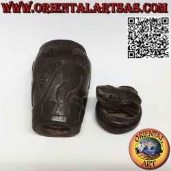Round box for medicine inlaid by hand in Borneo ironwood Eusideroxylon Zwageri excavated carved and decorated by the Dayaks of Borneo with frog on the cap and animals and flowers in the box. From a private collection in Sarawak, acquired in 1983.