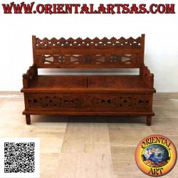 Chest bench with inlaid back and central opening in antique teak wood, one-of-a-kind handmade