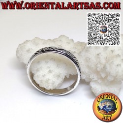 Anello a fedina da 4 mm. con intagli a righe oblique tra due righe parallele, realizzato in solido argento 925 ‰ anallergico. La superficie è parzialmente brunita per mettere in risalto la lavorazione e garantire la sua bellezza col passare degli anni. Non contiene nickel