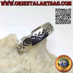 Realizzato artigianalmente in Thailandia con design etnico. Anello in argento 925‰ anallergico. La superficie è parzialmente brunita per mettere in risalto la decorazione, e non è trattata né placcata quindi garantisce la sua bellezza col passare degli anni.