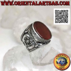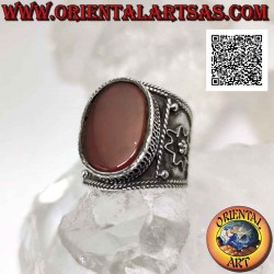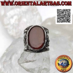 Anello in argento a fascia larga con corniola ovale grande e decorazione etnica a filigrana fatta a mano