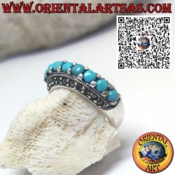Elegante anello a fascia in argento 925, decorato con una fila centrale di turchesi incastonati tra due file di marcassite. Design raffinato con uno stile vintage e una forte personalità, perfetto per chi ama gioielli dallo stile classico e distintivo.