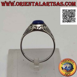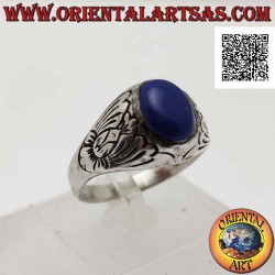 Anello in argento con lapislazzulo ovale cabochon con fiore di loto inciso sui lati