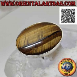 Anello in argento con grande occhio di tigre ovale a striature verticali su montatura liscia (regolabile)
