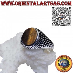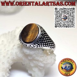 Anello in argento con occhio di tigre ovale cabochon e rombi incisi...
