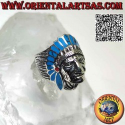 Anello in argento, testa Indiano nativo d'America con volto scolpito e copricapo in piume in turchese, medio