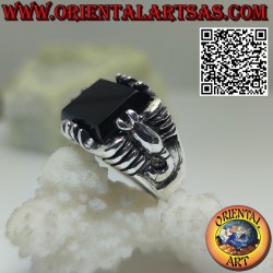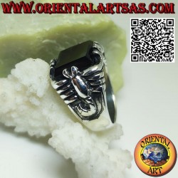 Anello in argento da uomo con onice rettangolare smussata incastonata tra due scorpioni ad altorilievo sui lati. Realizzato da abili artigiani tramite un antica tecnica della cera persa in solido argento 925 ‰ anallergico senza nickel . La superficie è in parte brunita il che ne garantisce la bellezza con il passare dell'anni. (Non é placata)