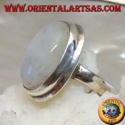 Bellissimo Anello con pietra di luna arcobaleno cabochon ovale su una montatura semplice con bordino in solido argento 925 ‰ anallergico, pezzo unico.. La superficie è parzialmente brunita per mettere in risalto la lavorazione e garantire la sua bellezza col passare degli anni. Senza nickel