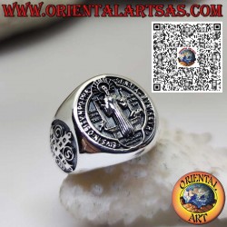 Anello in argento sterling 925 con sigillo di San Benedetto e croce ai lati, simbolo di fede e potente amuleto di protezione contro il male. Lavorato con finitura artigianale.