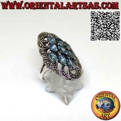 Anello in argento spoletta con 9 topazio azzurro a navetta e marcasite