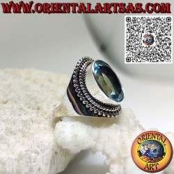 Bellissimo Anello in argento con topazio azzurro ovale grande contornato da treccie su montatura larga . Realizzato in argento 925‰ anallergico senza nichel, la superficie è in parte brunita il che ne garantisce la bellezza con il passare dell'anni ( non é placata ) rimane inalterato nel tempo