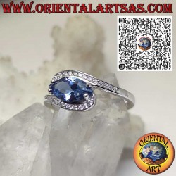 Raffinato anello in argento sterling 925 con Topazio Blu di Londra naturale taglio navetta incastonato in posizione trasversale e impreziosito da zirconi luminosi sui lati.