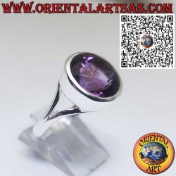 Elegante anello in argento con ametista naturale tonda, incastonata in un raffinato bordo liscio alto che ne esalta la brillantezza e il colore intenso.