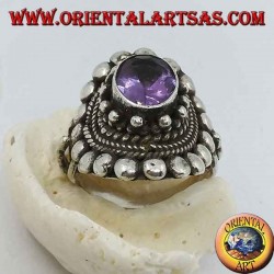Anello in argento in stile etnico con ametista tonda cabochon e...