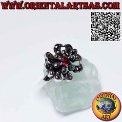 Anello in argento a forma di fiore con un granata tondo centrale incastonato contornato da marcasite, realizzata a mano in argento 925 ‰ anallergico. La superficie è parzialmente brunita per mettere in risalto la lavorazione e garantire la sua bellezza col passare degli anni. Senza Nickel