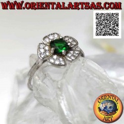 Anello in argento a fiore "fragola selvatica" con smeraldo di sintesi tondo incastonato e petali di zirconi