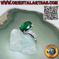 Anello in argento 925 ‰ rodiato smeraldo sintetico ovale incastonato su montatura asimmetrica e tre zirconi sui entrambi i lati incastonati