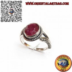 Un gioiello che combina la bellezza classica del rubino con un design distintivo e artigianale. Questo anello in argento 925 monta un elegante rubino naturale dal taglio ovale come protagonista. La gemma è incastonata e valorizzata da un'opulenta bordatura in argento, composta da una fitta serie di piccole sfere e motivi decorativi finemente lavorati. Questa ricca ornamentazione crea un effetto "halo" testurizzato e accentua la profondità del colore del rubino. Un pezzo ideale per chi cerca un anello che sia sia prezioso che etnico nel dettaglio.