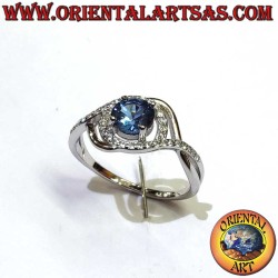 Anello in Argento con Zaffiro Tondo e Contorno Asimmetrico di Zirconi