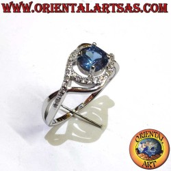Anello in Argento 925 con Zaffiro Sintetico Tondo e Contorno Asimmetrico di Zirconi