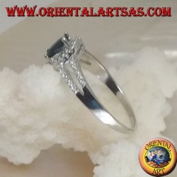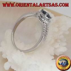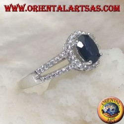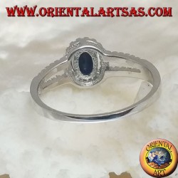 Anello in argento con zaffiro sintetico ovale incastonato contornato da zirconi e due linee laterali
