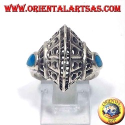 Elegante anello in Argento 925 a forma di conchiglia alta traforata con due gocce di turchese naturale sui lati. Simbolo di femminilità, protezione e saggezza. Altezza 19 mm, peso 7 grammi. Un gioiello raffinato dallo stile marino e spirituale.