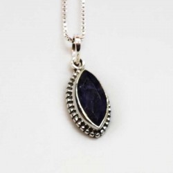 Raffinato ciondolo in Argento 925 con un Zaffiro Naturale taglio navetta (marquise). La gemma è incastonata in una delicata cornice lavorata a Sfere, un dettaglio che ne esalta il fascino vintage e artigianale.