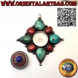 Spettacolare antico Gao Kalachakra enorme con quatro turchesi a goccia più quatro coralli ovali ed un lapis centrale contornato da altri coralli tondi