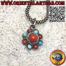 Ciondolo a fiore margherita con turchesi tibetani e coralli antichi alternati realizzati a mano in Nepal in argento 925‰ anallergico. La superficie è parzialmente brunita e non è trattata né placcata quindi garantisce la sua bellezza col passare degli anni.
