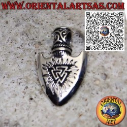 Ciondolo artigianale in argento sterling 925 a forma di punta di freccia vichinga, simbolo di forza, protezione e coraggio. Al centro del pendente sono incisi due potenti simboli della mitologia norrena: