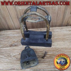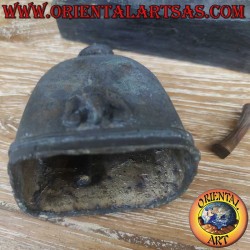 Antica campana in bronzo con Airavata (elefante a tre teste) ad alto rilievo 3D. Nella mitologia induista, Airavata è la cavalcatura del dio Indra, custode dei punti cardinali e simbolo della pioggia, fertilità e abbondanza. Le tre teste rappresentano Passato, Presente e Futuro oppure Cielo, Terra e Inferno. In Thailandia e Laos, è simbolo nazionale di protezione e maestosità. Provenienza: villaggi Karen della Birmania. Materiale: bronzo. Altezza campana 15 cm, base 10x7 cm, peso 780 gr. Struttura totale: altezza 27 cm, base 21x11 cm. Pezzo unico fatto a mano.