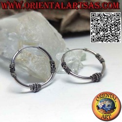 Orecchini in argento cerchio con 2 inserti lavorati a ed uno centrale a spirale del diametro di mm. 30 , realizzati da abili artigiani in solido argento 925 ‰ anallergico senza nickel. La superficie è parzialmente brunita e non è placcata, garantendo così la sua bellezza negli anni