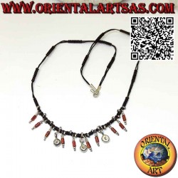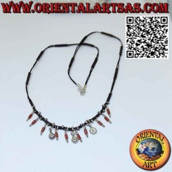 Collana Tribale in filo cerato marrone annodato con monili in solido argento 995 ‰ anallergico e pietra del sole pendenti Fatta a mano dai Karen