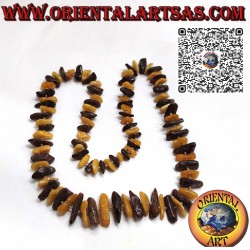 Questa collana è un'elegante fusione di ambra naturale chiara e scura proveniente dal Baltico. La lunghezza della collana la rende un accessorio versatile, adatto a essere indossato in varie occasioni. Gli ampi pezzi di ambra, con le loro sfumature che vanno dal dorato chiaro al marrone scuro, aggiungono un tocco di calore e raffinatezza a qualsiasi outfit. Ogni pezzo di ambra ha una storia unica, plasmata dal tempo e dalla natura, e la loro disposizione sulla collana crea un interessante equilibrio visivo.